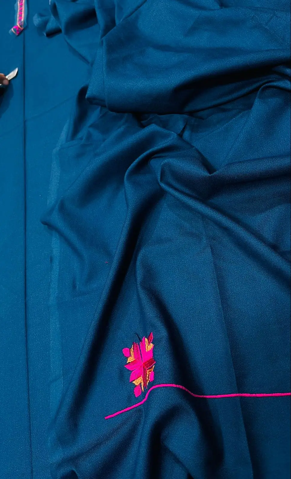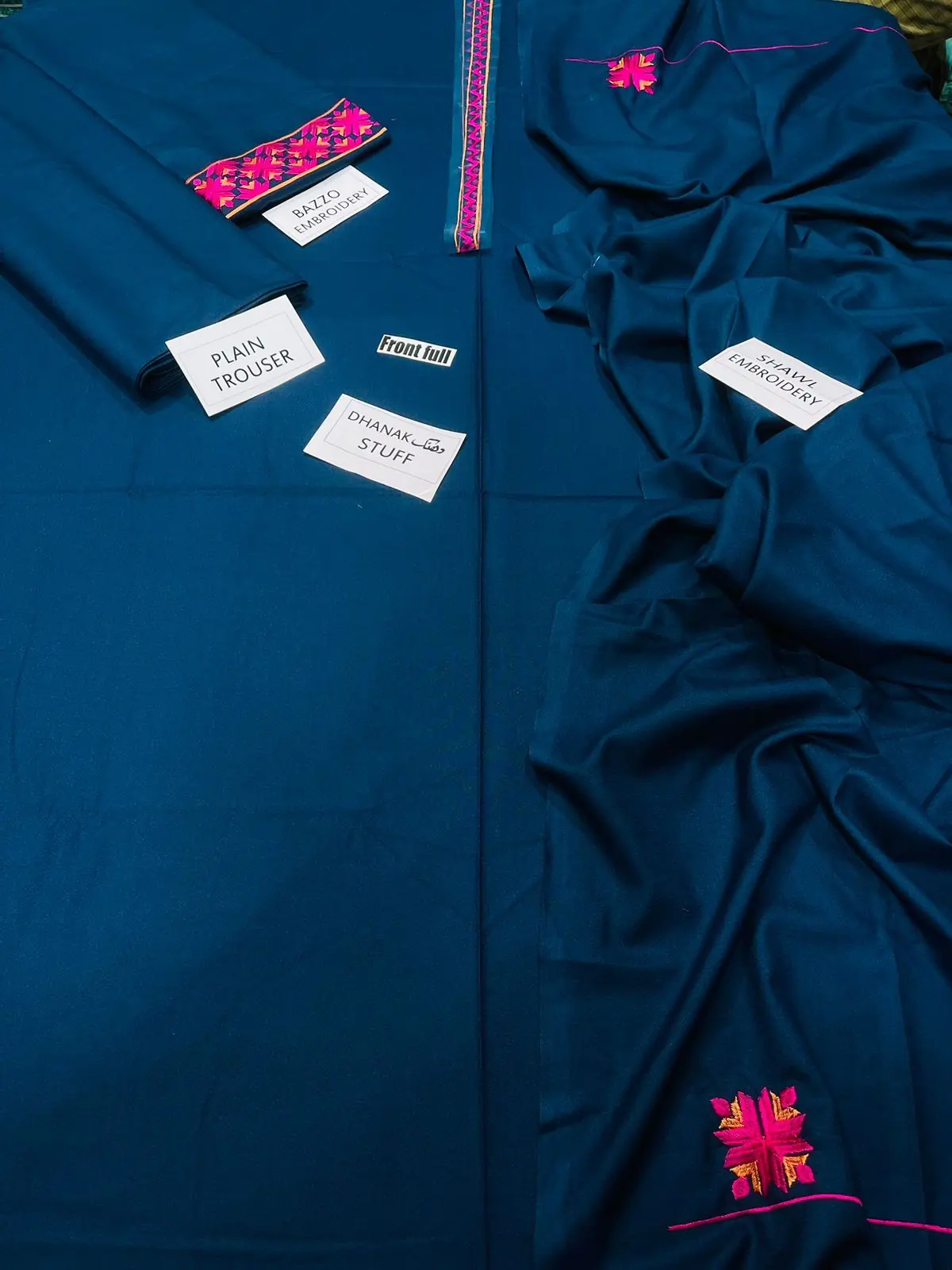 ASLING DHANAK 3PC Fabric DHANAK new Volume Fabric Quality:DHANAK 100100 Description 3PC Suit Dhanak Shirt Neck embroidery Sleeves heavy embroidery Trouser Back Plain DHANAK fully embroidered Shawl Free Delivery